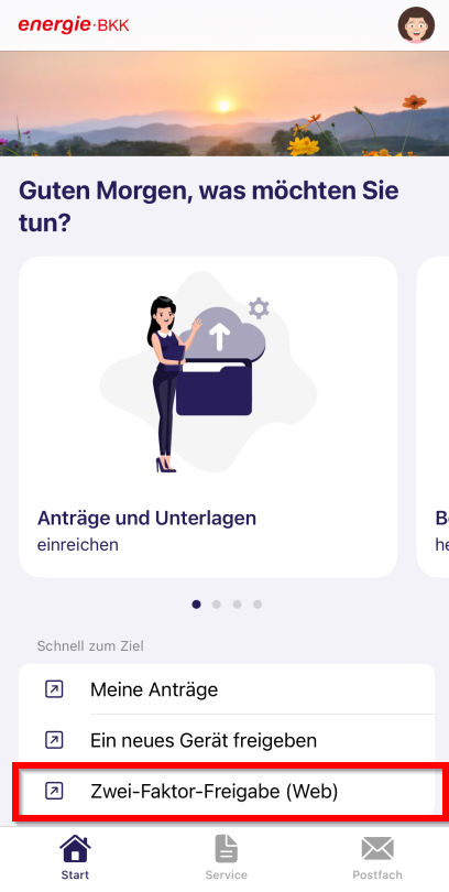 - In der energie-BKK App sehen Sie nun eine Übersicht. Scrollen Sie nach unten und wählen Sie den Bereich „Zwei-Faktor-Freigabe (web)“ unter der Rubrik „Schnell zum Ziel“.