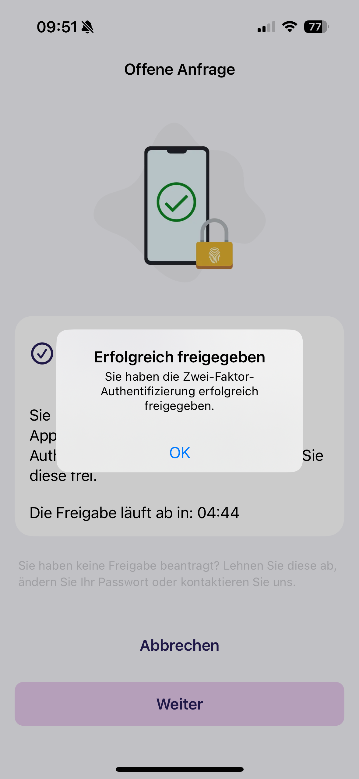 4. Nachdem der Code bestätigt wurde, sehen Sie die Meldung „Erfolgreich freigegeben“. Sie gelangen nun automatisch direkt in der Web-Version der Online-Geschäftsstelle.