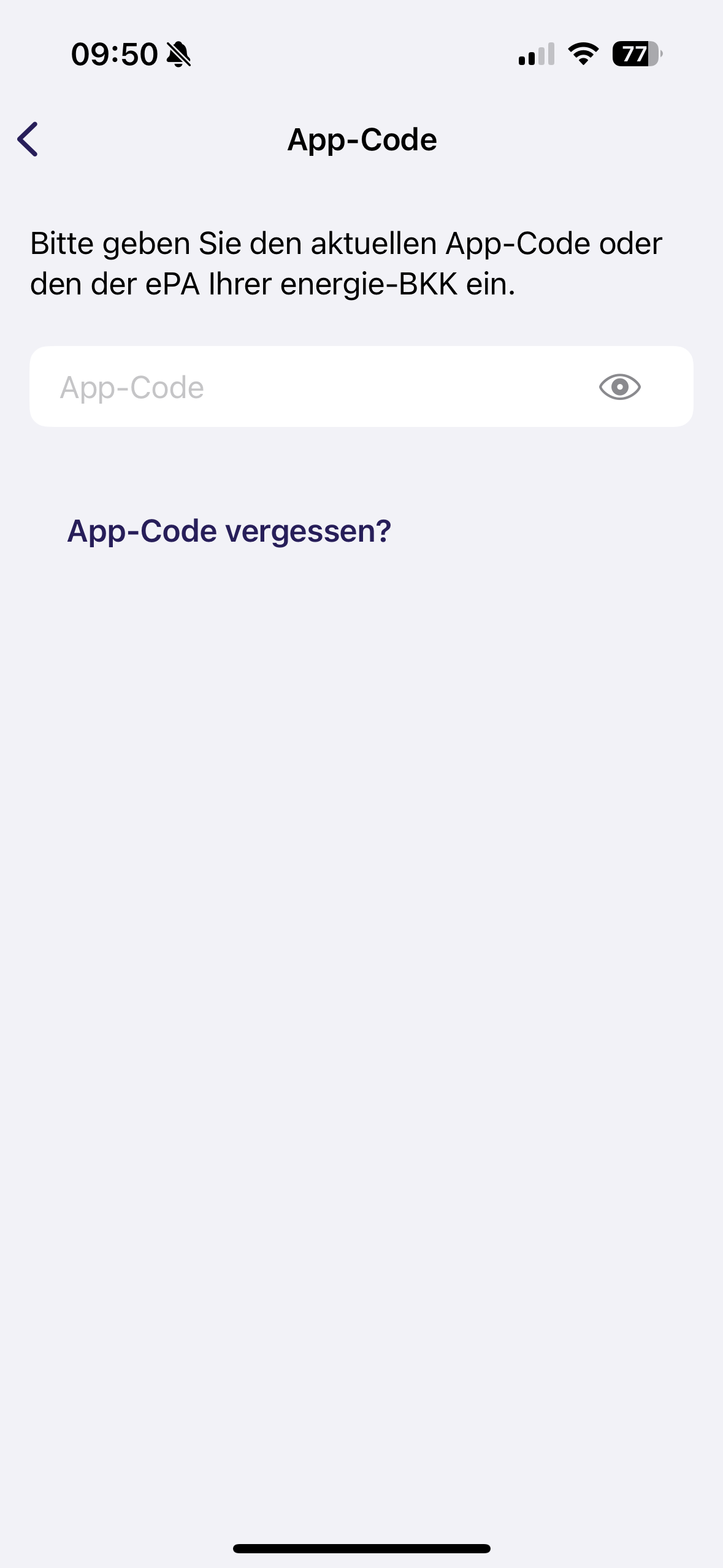 3. Es wird erneut die Eingabe des App-Codes oder eine biometrische Bestätigung verlangt. Geben Sie bitte den gleichen 6-stelligen App-Code ein, den Sie auch für Ihre ePA oder in der energie-BKK App verwenden.